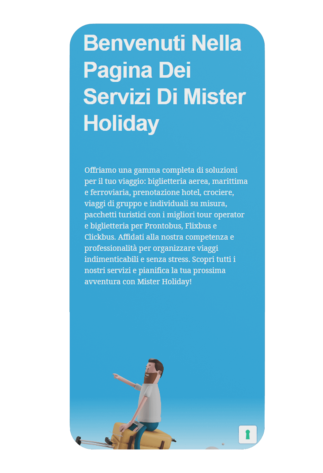 Mister Holiday Torre De’ Passeri necessitava di un sito vetrina che rappresentasse l’azienda. Lavorando a stretto contatto con il cliente è stato realizzato un sito in base all’esigenze. Troveremo dunque un sito vetrina, dinamico e giocoso, dove i colori principali sono arancione e azzurro. Così da mantenere i colori originali dell’azienda.
